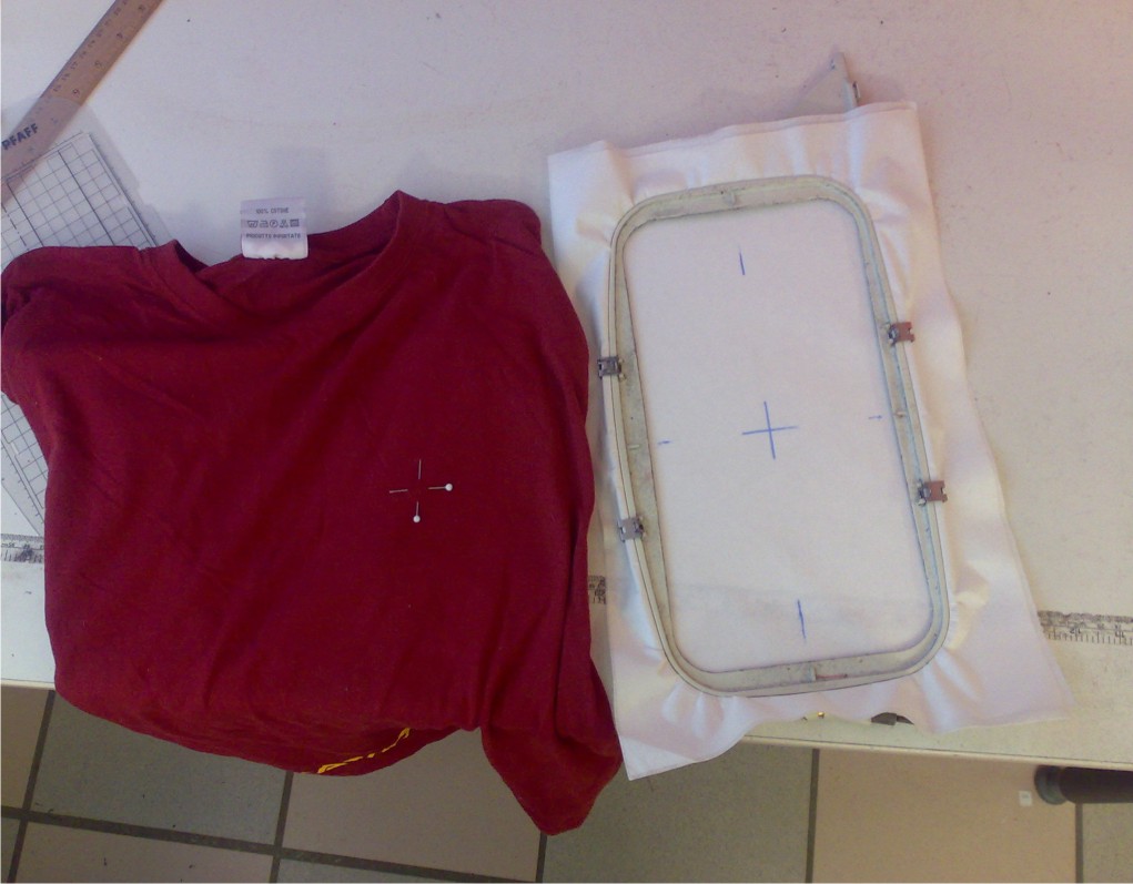 • Secondo metodo: due fogli di stabilizzatore incollati con colla spray e intelaiati. Si segnano i centri sullo stabilizzatore intelaiato e anche sul capo (in questo caso una T-shirt)